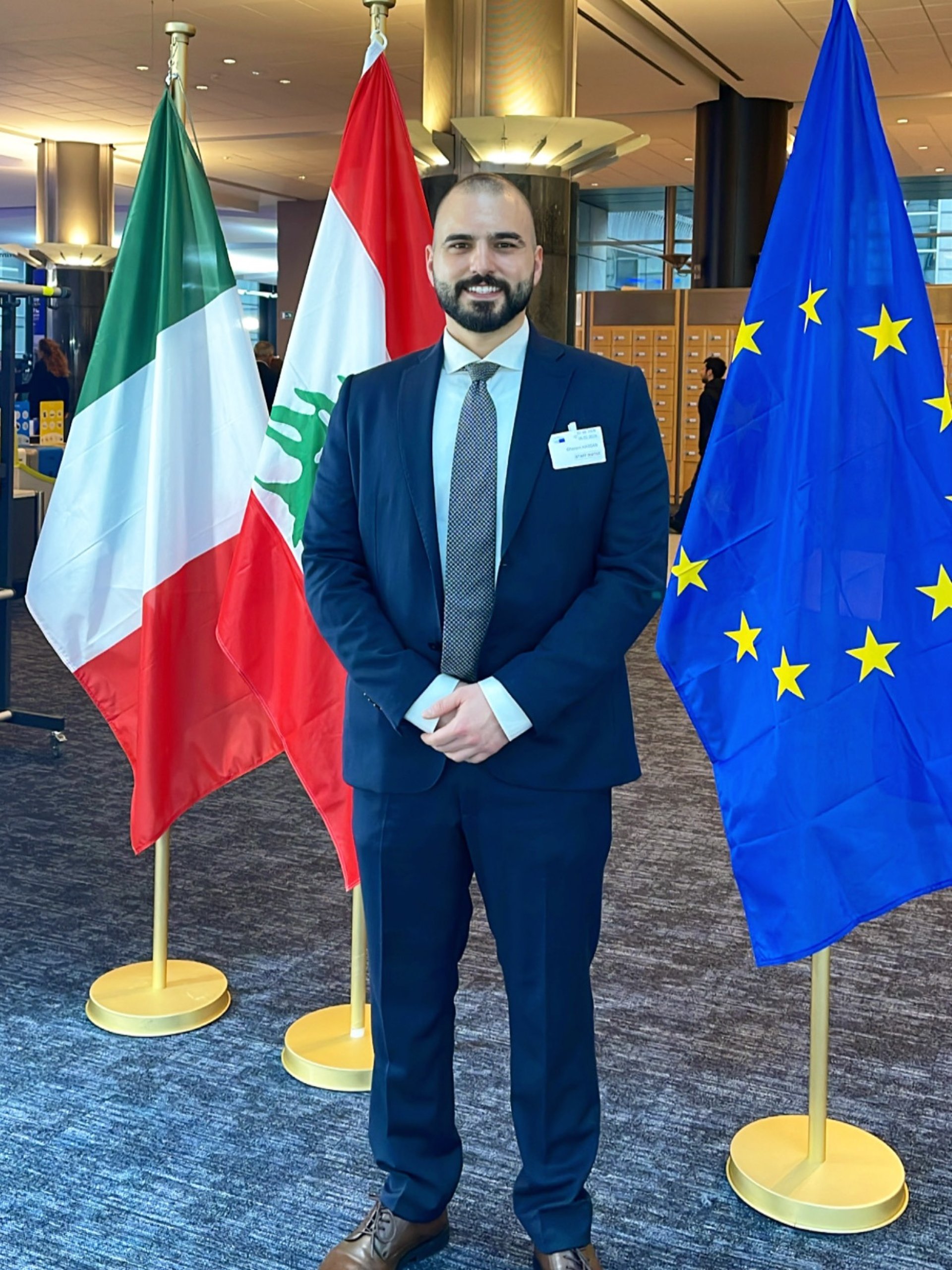 Ghanem Hassan proudly displayed the Lebanese Flag at the European Parliament during his 9th solo exhibition in Brussels, Belgium.